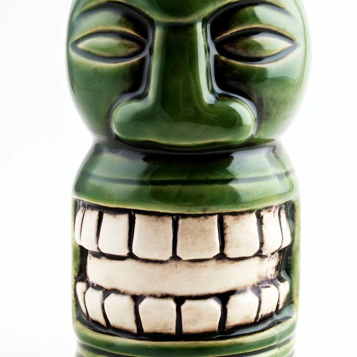 If you’re looking for a tiki mug that will stand out in a crowd of tiki cups, then you’ve found the right one. This Pineapple tiki is perfect for making all types of tropical cocktails. It is made of ceramic and has a high gloss finish. This glass has a green colored finish and features a face on the front of the glass with big white teeth. It stands 8.25″ in height with a rim diameter of 3.25″. It has a liquid capacity of 20 ounces.