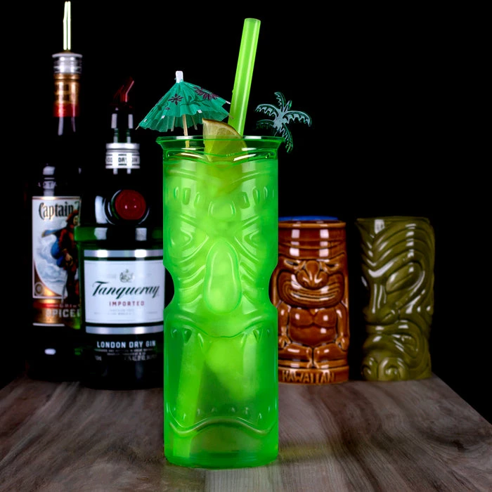 This fun tiki cup is the perfect cup to make your colorfully tropical drinks in. These cups are made of high quality durable plastic material that wont easily break and they feature an embossed tiki face design showcasing a slightly transparent green color. This cup is 8 1/2 inches in height with a 3.25 inch diameter and can hold 32oz of liquid.ย The tiki mixology trend is showing no signs of slowing down and we feel it is here to stay. Stock up on these great reusable tiki cups and enjoy one of the best movements in modern mixology.ย