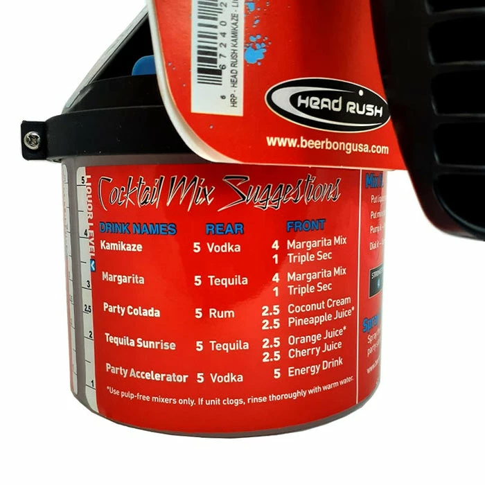 This Kamikaze liquor shooter has dual-chambers that keeps liquor & mixers separate until they are mixed together and sprayed into your buddyโs mouth! The pressure to spray is created by just a few pumps of the plunger. The shot comes out of the sprayer in a direct stream and you can adjust the liquor to mixer ratio by turning the dial. Drink recipes on the back and measuring lines on the side.