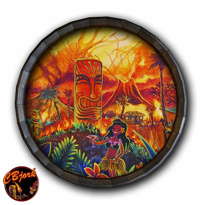 The Lucky Tiki Wood Barrel Top Sign or Clock features the whimsical and fun art of CBjork. This bright scene features happy tiki vibes that will look great hung anywhere! The art comes straight from painter CBjork, and even though it is a print, it looks like it was painted right on the Barrel Top!