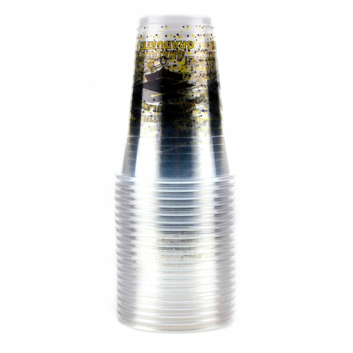 Celebrate that big special day with these graduation themed plastic cups. Each cup has an all around print of graduation caps and diplomas. These cups are disposable and provide easy clean up after the party. This package comes with 20 cups and they hold 16 ounces of liquid.