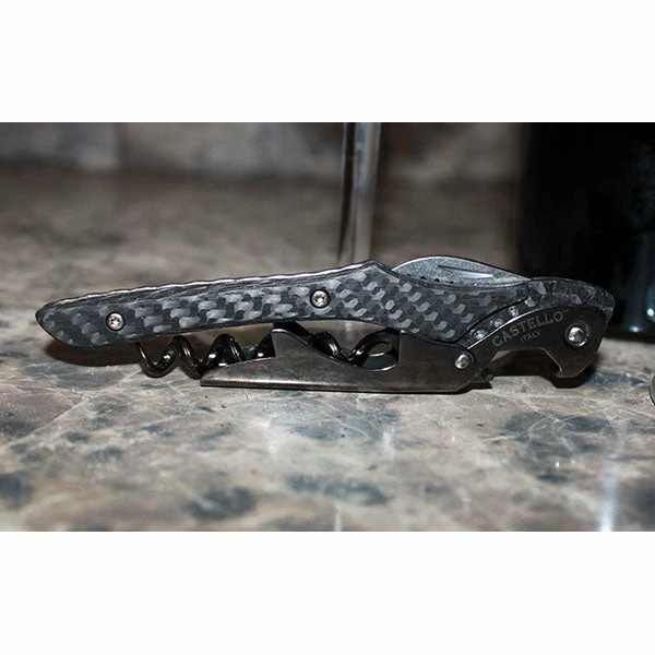 If you are looking for a high quality wine key, then this is the one you want! The Castello™ Carbon Fiber Handle Corkscrew is a top of the line wine bottle opener. It features a sleek carbon fiber handle, two-step lever, serrated foil cutting blade, bottle cap remover, and stainless steel metal parts treated with PVD. This unique professional corkscrew was designed in Italy and built with the precision of a race car.