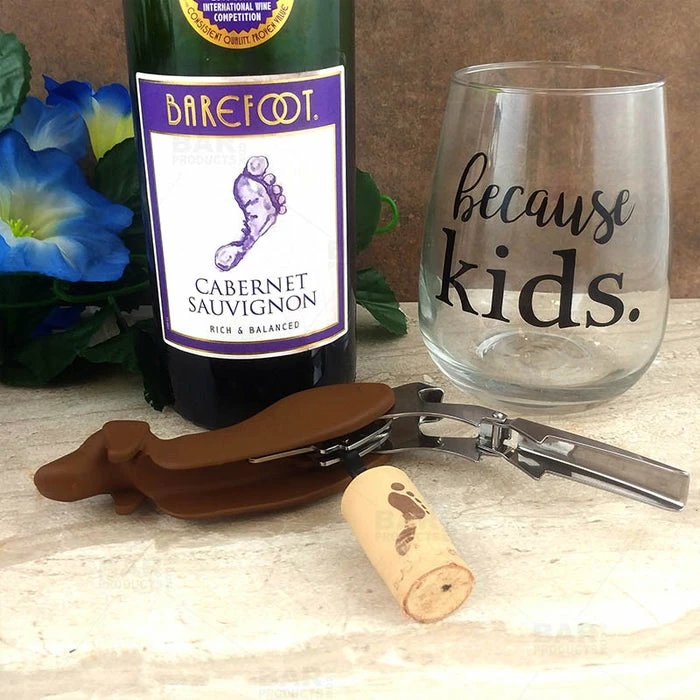 This pup is ready to party! The Winer Dog Corkscrew is an adorable novelty corkscrew that has all of the utility that anyone could wish for in their wine opener. Three stainless tools eject from the soft touch ABS handle. These tools include a double-hinged corkscrew, bottle opener and serrated foil cutter.